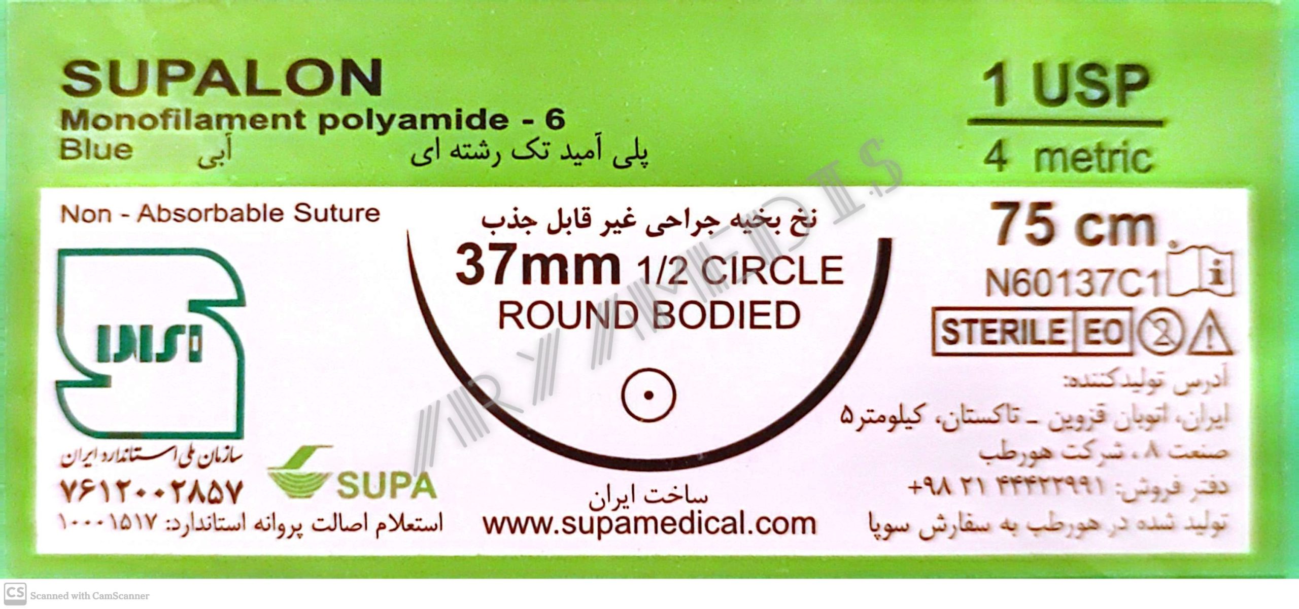 نخ و سوزن جراحی نایلون 1 راند سوزن 37 (غیر قابل جذب مصنوعی سوپا)